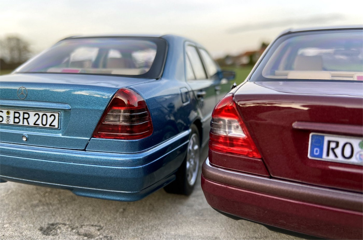 Zusammen mit dem blauen 500E ist auch die neue Farbvariante der W202 - 'Malachitgrün' - zu mir gereist. Als erstes Modell der zweiten Auflage hat sich im Verborgenen eine der aktuell Norev-typischen Verbesserungen eingeschlichen - dazu später mehr. Zum Vergleich habe auch noch das Modelissimo-Sondermodell in 'Onyxgrau' vor die Kamera gerollt, das in der Zwischenzeit auch zu mir gefunden hat.